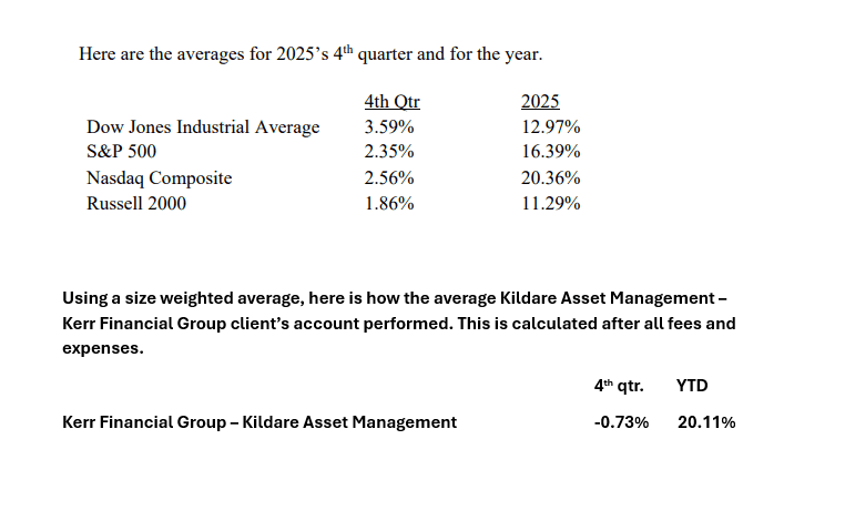 The following is a copy of the 2025 4th quarter letter sent to clients. It reviews the markets and the client account’s activity and performance for the 4th quarter of 2025.